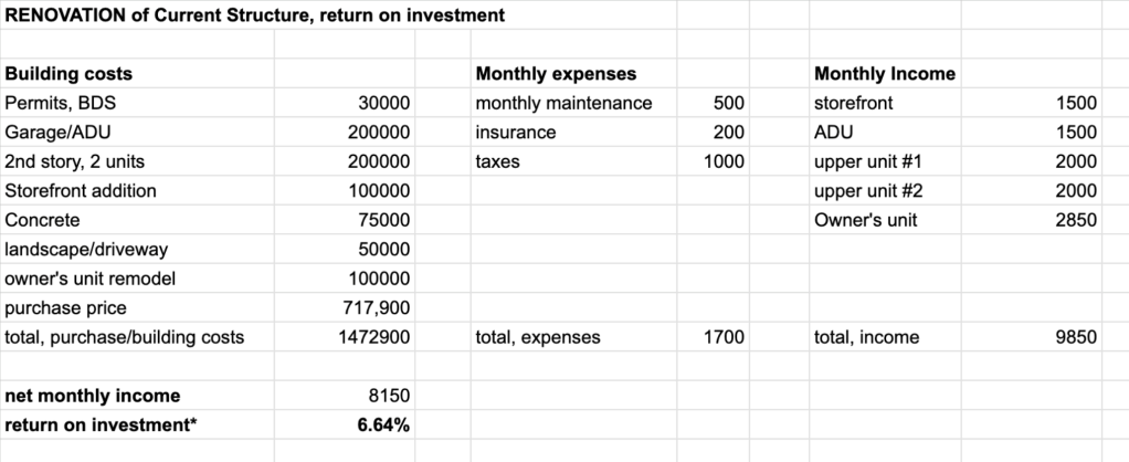 1) Renovate the existing structure to allow for 4 residential units and a retail/commercial storefront down to the sidewalk.